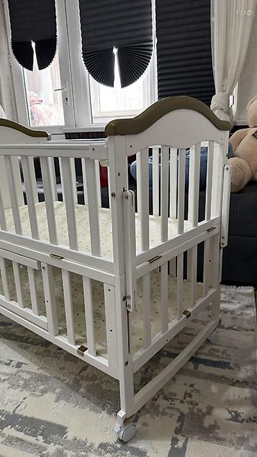 Детская кроватка-трансформер из массива дерева, белая с декоративными накладками оливкового цвета.