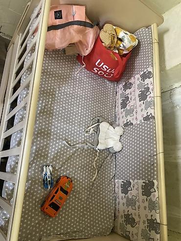- Просторное спальное место, матрас в комплекте на фото с защитными бортиками/бамперами с рисунком слонов.