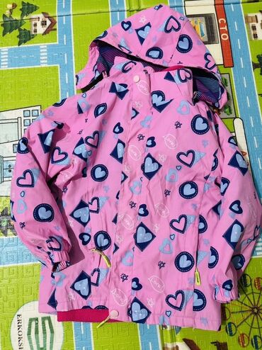 Детская розовая куртка-дождевик с подстежкой из флиса. Верхняя куртка украшена принтом с сердечками, ромбами и надписями. Застегивается на молнию и кнопки. Флисовая подстежка ярко-розового цвета также застегивается на молнию. Подходит для ношения в прохладную и дождливую погоду.