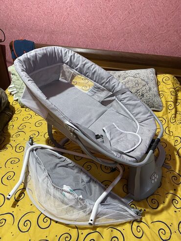 В комплекте на фото: люлька с тканевым чехлом, база-качалка, дуга/поручень, москитная сетка.