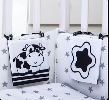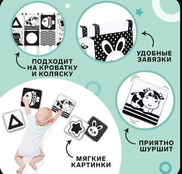 Мягкая книжка-бортик для малышей, выполненная по методике Гленна Домана, способствует раннему развитию зрения и познавательных навыков. Книжка имеет двусторонний дизайн с контрастными черно-белыми изображениями, которые стимулируют зрительное восприятие младенцев. Изображения включают различные геометрические фигуры, животных (корова, рыба, заяц, сова, улитка) и абстрактные узоры. Каждая страница издает приятный шуршащий звук, что привлекает внимание ребенка и развивает слух и тактильные ощущения. Удобные завязки позволяют легко крепить книжку к кроватке или коляске, превращая ее в развивающий бортик. Мягкие картинки безопасны для малышей и подходят для игр. Это универсальное решение для развития малышей с первых дней жизни. ПИСАТЬ НА ВАТСАП
