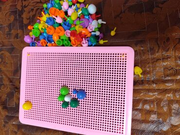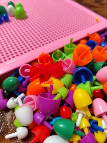 - Набор для творчества: перфорированное поле розового цвета и большое количество пластиковых «грибочков»-фишек.