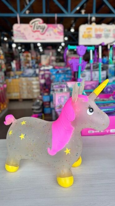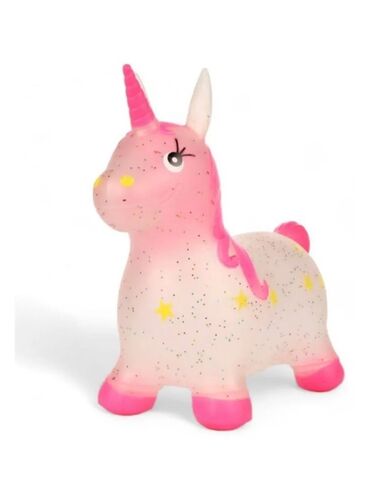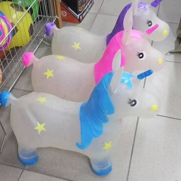 - Тип: надувной прыгун (рид-он) — ребёнок удерживается за уши/рог и подпрыгивает, развивая равновесие и координацию.