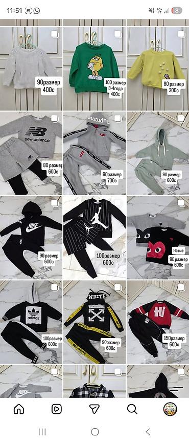 - Комплекты спортивные (худи + штаны/шорты): Nike, Adidas, Off-White, Jordan, Supreme, New Balance — указанные размеры: 80, 90, 100, 150.