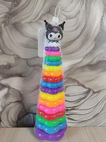 - Яркая детская пирамидка из пластиковых колечек волнистой формы.