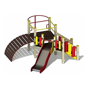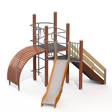 - Многофункциональный модуль для детской площадки: горка, переходы на двух уровнях, арочный мостик, лестница/скалодром, поручни и ограждения.