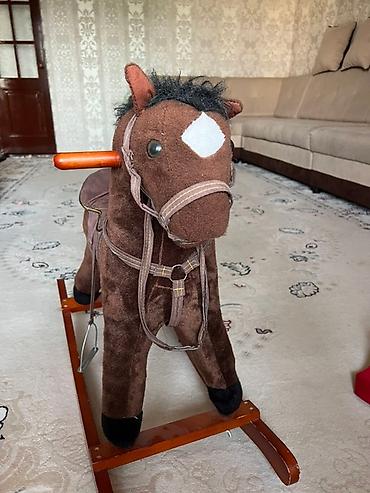 - Материал: мягкий плюшевый корпус с гривой и хвостом, деревянные полозья и рама.