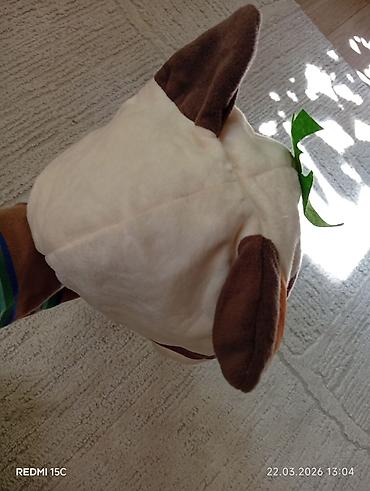 - Дизайн: коричнево‑белые пятна, ушки, спереди декоративный зелёный листочек.