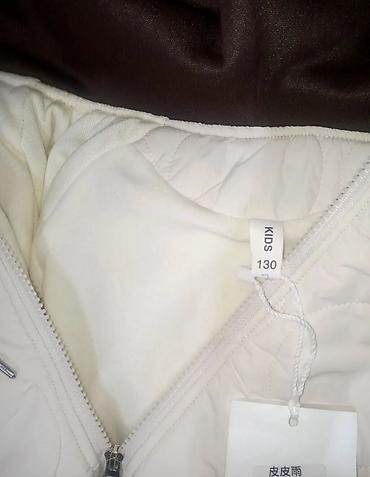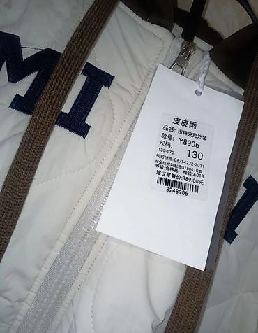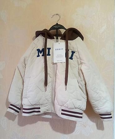 - Цвет: молочный с контрастным тёмно-коричневым капюшоном и шнурами; синие нашивные буквы на груди
