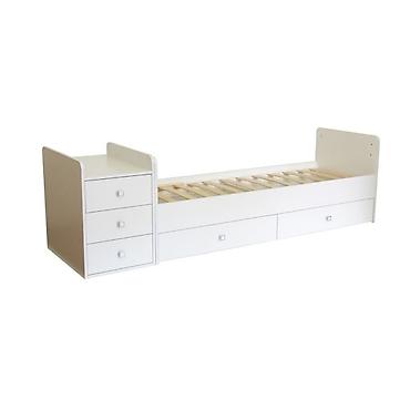 - Функция трансформации: от кроватки с бортиками для малыша до подростковой односпальной кровати длиной 170 см. Комод можно устанавливать слева/справа, а бортики снимаются.