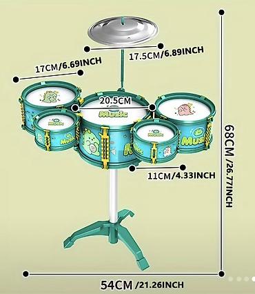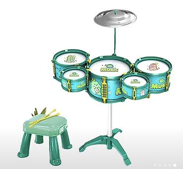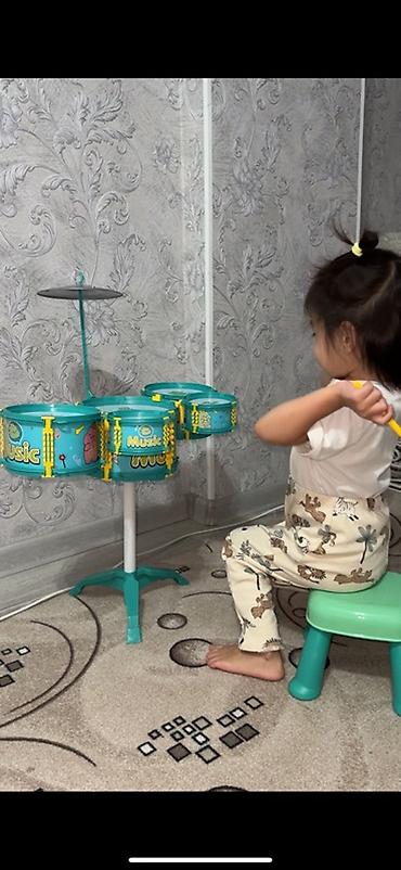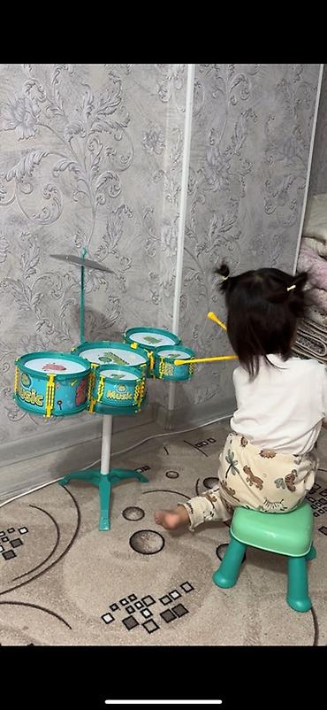 Яркий дизайн с мультяшными принтами. Лёгкая сборка, все элементы из прочного пластика, удобная посадка за счёт отдельного табурета. Подходит для первых занятий ритмом и развития слуха и координации у детей.