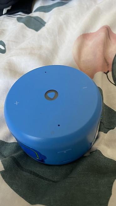 Умная колонка с голосовым помощником (компактная «таблетка» форм‑фактора). - Цвет: бирюзовый, с декоративными наклейками по корпусу. - Кнопки на верхней панели: увеличение/уменьшение громкости, от...