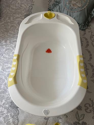 В наборе с ванной также идет ковшик. Под ковш предусмотрена специальная выемка держатель. Рядом с ней также располагаются два дополнительных углубления, которые можно использовать в качестве подставки для купальных принадлежностей и моющих средств для малыша. Не придется искать для них дополнительное место и они всегда будут под рукой во время купания новорожденного. Ванночка имеет бортики с резиновыми вставками и слив с резиновой пробкой заглушкой, который не протекает.