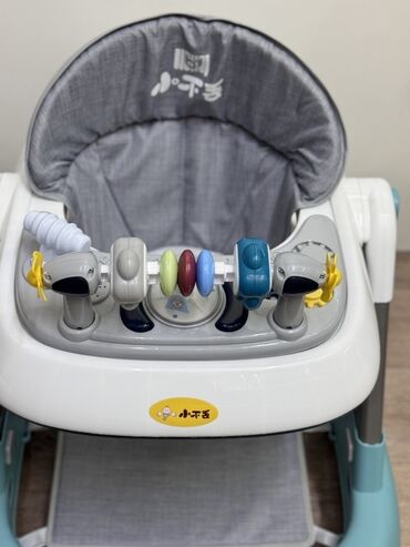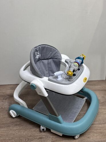 Детские ходунки 2в1 толокар с игровой панелью - Тип: классические ходунки с мягким сиденьем и высокой спинкой - Цвета: бирюзовая база, белый корпус, серая ткань - Игровая панель: вращающиеся разн...