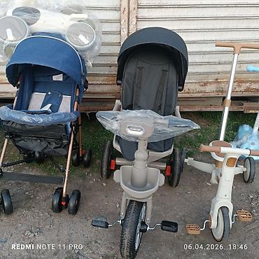 - Легкая прогулочная коляска с капюшоном, спинкой, корзиной для вещей и поворотными колесами.