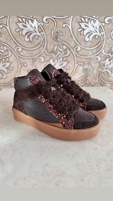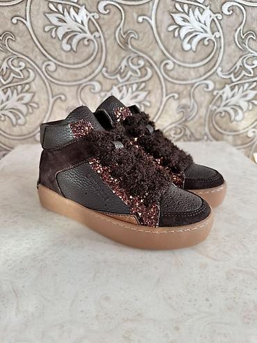 - Материалы: комбинированная натуральная кожа с фактурой, замша, декоративные вставки с глиттером. Объёмные «пушистые» шнурки в тон.