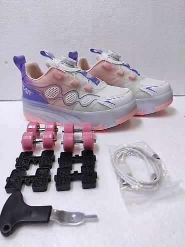 - 2-в-1: обычные кроссовки и роликовая обувь. На подошве установлены выдвижные/съемные ролики (по два на каждой подошве).