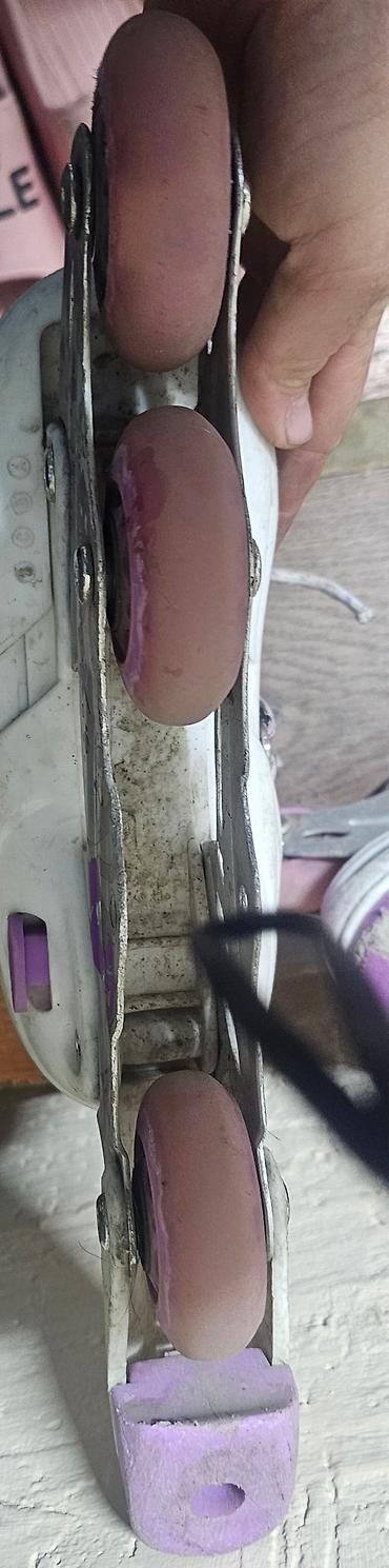 Детские ролики фиолетового цвета. Оснащены шнуровкой и застежкой для надежной фиксации ноги. Рама коньков выполнена из прочного металла, колеса обеспечивают плавное катание. Подходят для начинающих и продвинутых роллеров. состояние б/у нету 1 колеса на 1 ролике размер 31-34.Посмотреть в Рабочем городке Айни Поваринская в выходные дни Все вопросы на русском языке отдам за 2 литра колы