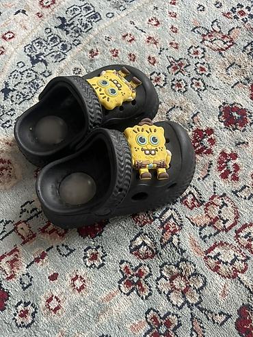 Детские сабо (кроксы) черные с декоративными значками «Губка Боб» на верхе.