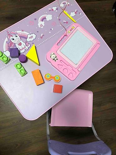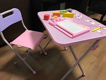 Комплект складной. Подходит для кормления, игр и обучения. Поверхность столешницы ламинированная с нанесением ярких познавательных рисунков. На поверхности стола можно рисовать маркером на водной основе.