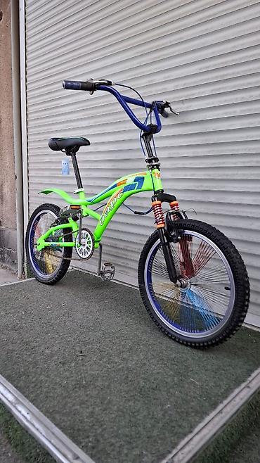 - Ярко‑зелёный BMX‑стиля с двухподвесом: передняя пружинная вилка и задний амортизатор, высокий синий руль, колеса 20" с цветными спицами, ободные тормоза, пластиковые крылья, односкоростная трансмиссия, платформа‑педали, регулируемое по высоте седло.