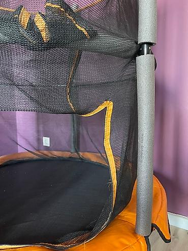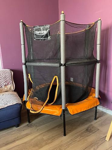 - Компактный домашний батут с ограждением по периметру для безопасных прыжков.
