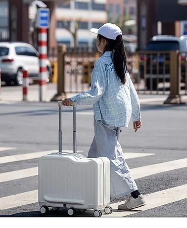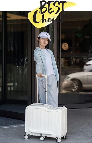 - Функционал: чемодан на колёсах с интегрированным сиденьем-площадкой — ребёнок может сидеть во время ожидания или катиться, держась за выдвижную ручку.