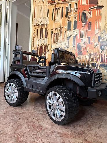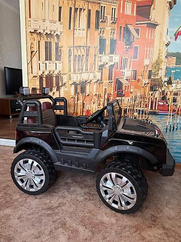 - Кузов: стильный черный джип с высоким клиренсом и крупными резиновыми колесами для езды по двору и парку.