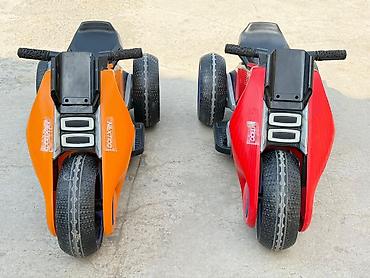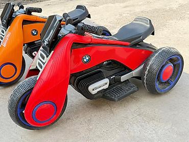 Детский электромотоцикл-трицикл - Тип: электрический трицикл для детей - Дизайн: спортивный супербайк, яркий металлизированный красный цвет, аэродинамические обтекатели, «выхлопы» по бокам, панель...