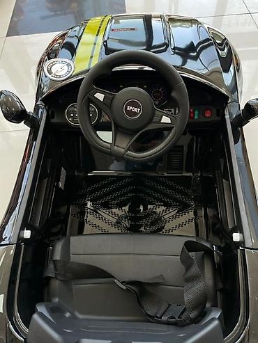 Электромобиль для детей в черном цвете, выполненный в стиле современного спортивного автомобиля. Оснащен яркими светодиодными фарами спереди и сзади, а также декоративными элементами в виде хромированной решетки радиатора и имитации выхлопных труб. На капоте и боковых частях кузова присутствуют две ярко-желтые полосы. Внутри салона есть рулевое колесо с надписью "SPORT", сиденье с ремнем безопасности и приборная панель с имитацией различных элементов управления. Имеются боковые зеркала заднего вида и задний спойлер. Подходит для развлечения и развития координации у детей.