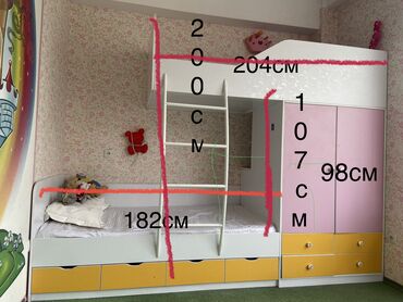 Продаю гарнитур детский выдерживает более 100 кг он был двухъярусный мы его отделили но можете обратно собрать, входят кровати, задвижной, шкафчик, письменный стол, шифоньер и полки для книг