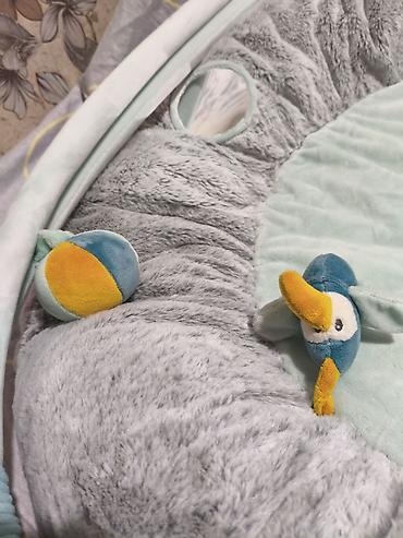 - Подвесы: мягкие игрушки-птички и мячики, контрастные цвета для стимуляции зрения и хватательного рефлекса.