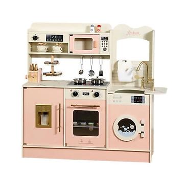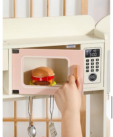 Игровой кухонный набор для детей, выполненный в пастельных тонах. Он оснащен многочисленными интерактивными элементами, включая раковину с краном, плиту с конфорками, духовку, микроволновую печь, кофемашину, холодильник и даже стиральную машину. В комплекте также предусмотрены кухонные принадлежности, такие как кастрюли, сковорода, лопатки, а также имитация продуктов, например, бургер и десерты. Этот набор способствует развитию воображения и социальных навыков у детей, позволяя им имитировать приготовление пищи и ведение домашнего хозяйства. Подходит для детей, интересующихся ролевыми играми.