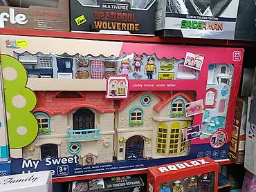 - 23 предмета в наборе: мебель для разных комнат (кровать, шкафы, кухонный блок, столики, стулья, ванная, светильники и др.), аксессуары, а также фигурки членов семьи.