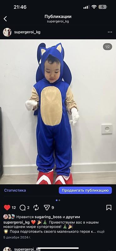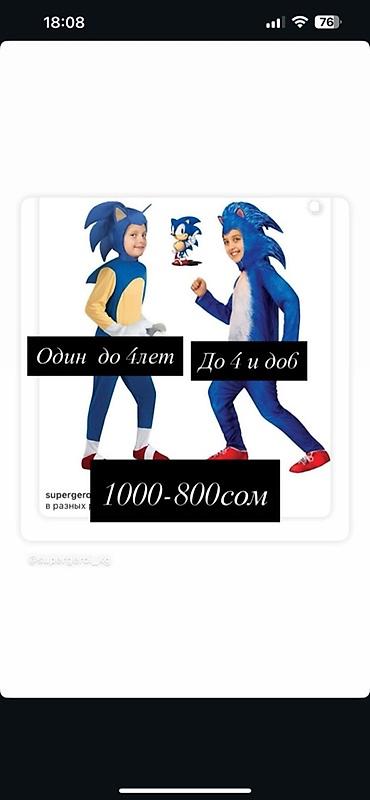 - Костюмы Соника (разные модели): варианты «до 4 лет» и «до 4 и доб.». На изображении указаны цены 1000–800 сом.