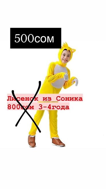 - Жёлтый лисёнок из вселенной Соника: комбинезон с капюшоном-ушками и накладными перчатками. На изображении указана цена 500 сом.