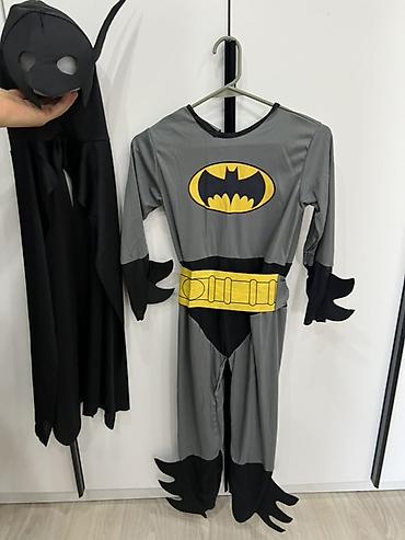 - Бэтмен: серо‑чёрный комбинезон с эмблемой на груди и жёлтым «поясом», длинный чёрный плащ-накидка и маска.