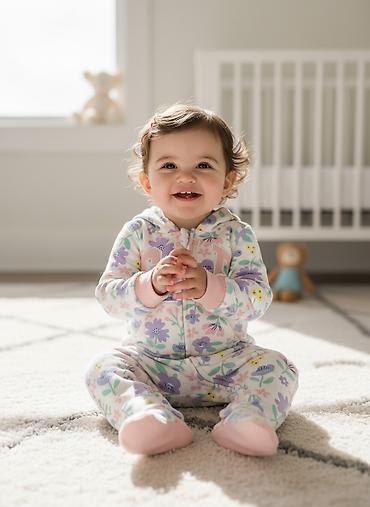 Детские комбинезоны GAP с капюшоном, цветочный принт (розовый фон, сиренево‑зелёные и жёлтые цветы). Модель с длинным рукавом и манжетами, два передних кармана-кенгуру, крупная вышивка/аппликация G...