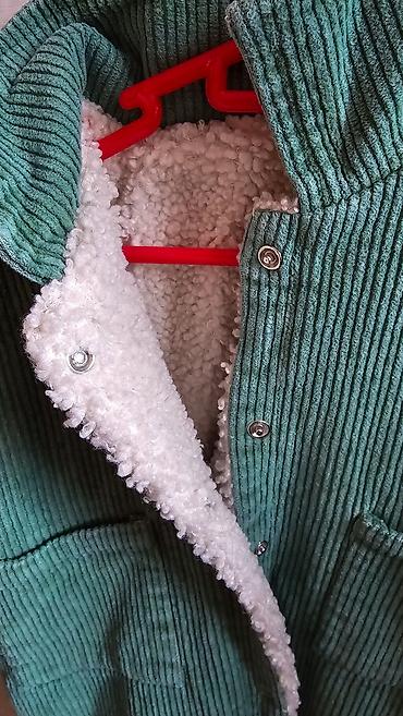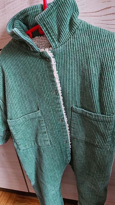 Детский комбинезон (весна-осень): вельвет, тёплый, внутри овчинка. Размер 6-9 месяцев. Выглядит хорошо, одевали только на улицу. Цвет зелёный.