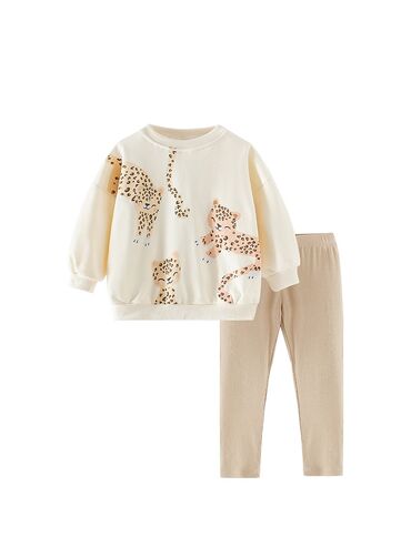 - Дизайн: кремовый свитшот с принтом милых леопардиков; бежевые лосины в рубчик.