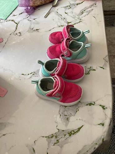 - Пара кроссовок для девочки: розово-бирюзовые, легкие, сетчатый верх, белая подошва, удобная липучка и петелька на пятке для быстрого надевания.