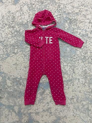 - Бордовый велюровый ромпер с капюшоном и ушками, на молнии, в белый горошек, карманы-кенгуру, принт “CUTE”.
