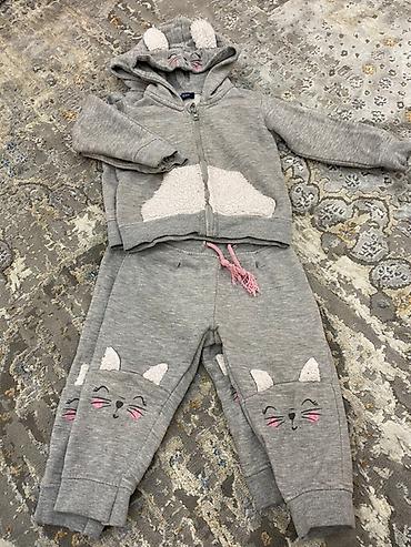 - Спортивный костюм серого цвета: толстовка на молнии с капюшоном-ушками и накладками из мягкого флиса, брюки на резинке с забавными мордочками котят на коленях, шнурок на поясе.