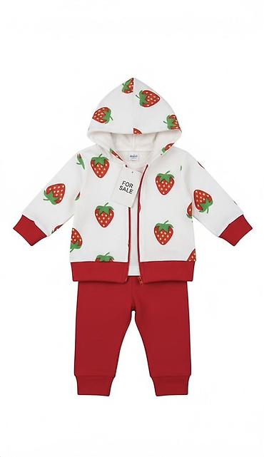 2) Белая кофта на молнии с капюшоном и принтом клубники, красные брюки.