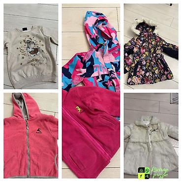 - Толстовки и флиски: бежевая с принтом и золотистыми звездами; яркая ветровка-худи камуфляж розово-голубая; стеганая зимняя куртка с цветочным принтом и меховым капюшоном; розовая флисовая на молнии с капюшоном; малиновая флиска на молнии с карманами.