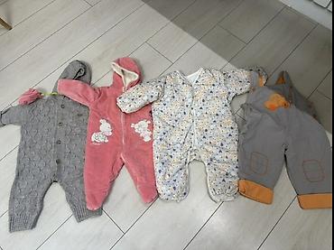 - Теплые комбинезоны для малышей: вязаный серый на пуговицах с капюшоном и варежками; розовый велюровый на молнии с капюшоном и вышивками; стеганый белый на молнии с рисунком; утепленный полукомбинезон серо-оранжевый с аппликацией машинки.