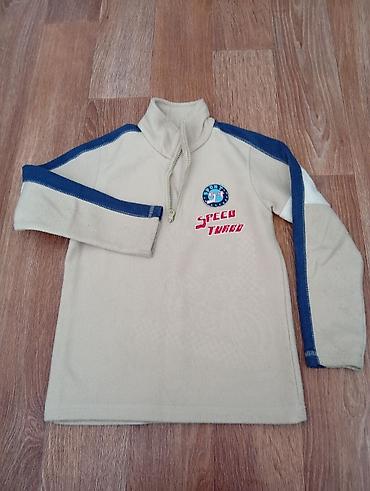 4) Бежевая флисовая кофта-полувер с короткой молнией. Контрастные синие полосы по рукавам, нашивка «Sport 5» и надпись Speed Turbo на груди. Высокий воротник, мягкий теплый флис.