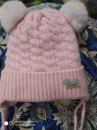3) Вязаная детская шапка розового цвета с косами, двумя пушистыми помпонами и завязками, нашивка «MIRU».