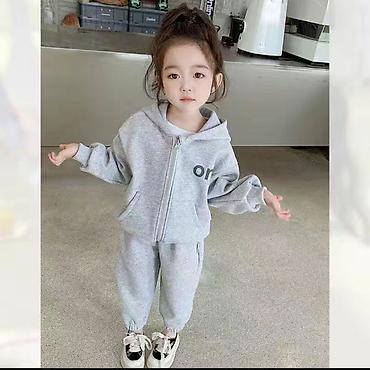 - Спортивный костюм: мягкий серый трикотаж на флисе, худи на молнии с капюшоном и карманами, минималистичный принт на груди; брюки на резинке с манжетами по низу. Удобный свободный крой для активных игр и прогулок.