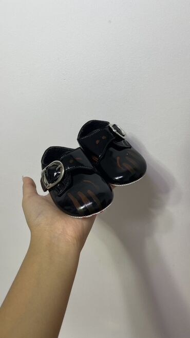 - Лаковые пинетки черного цвета с ремешком и крупной пряжкой; мягкая подошва для первых месяцев.